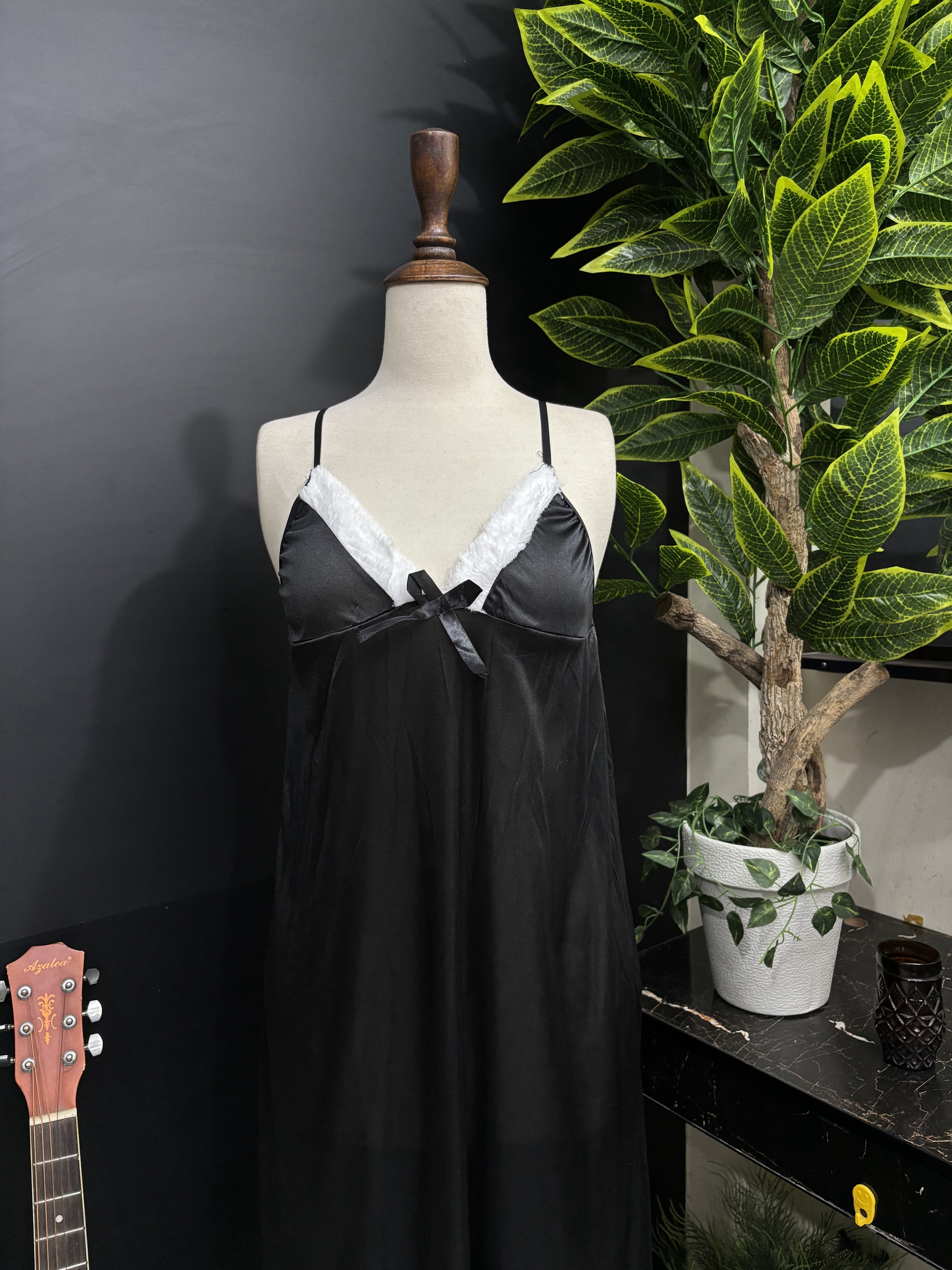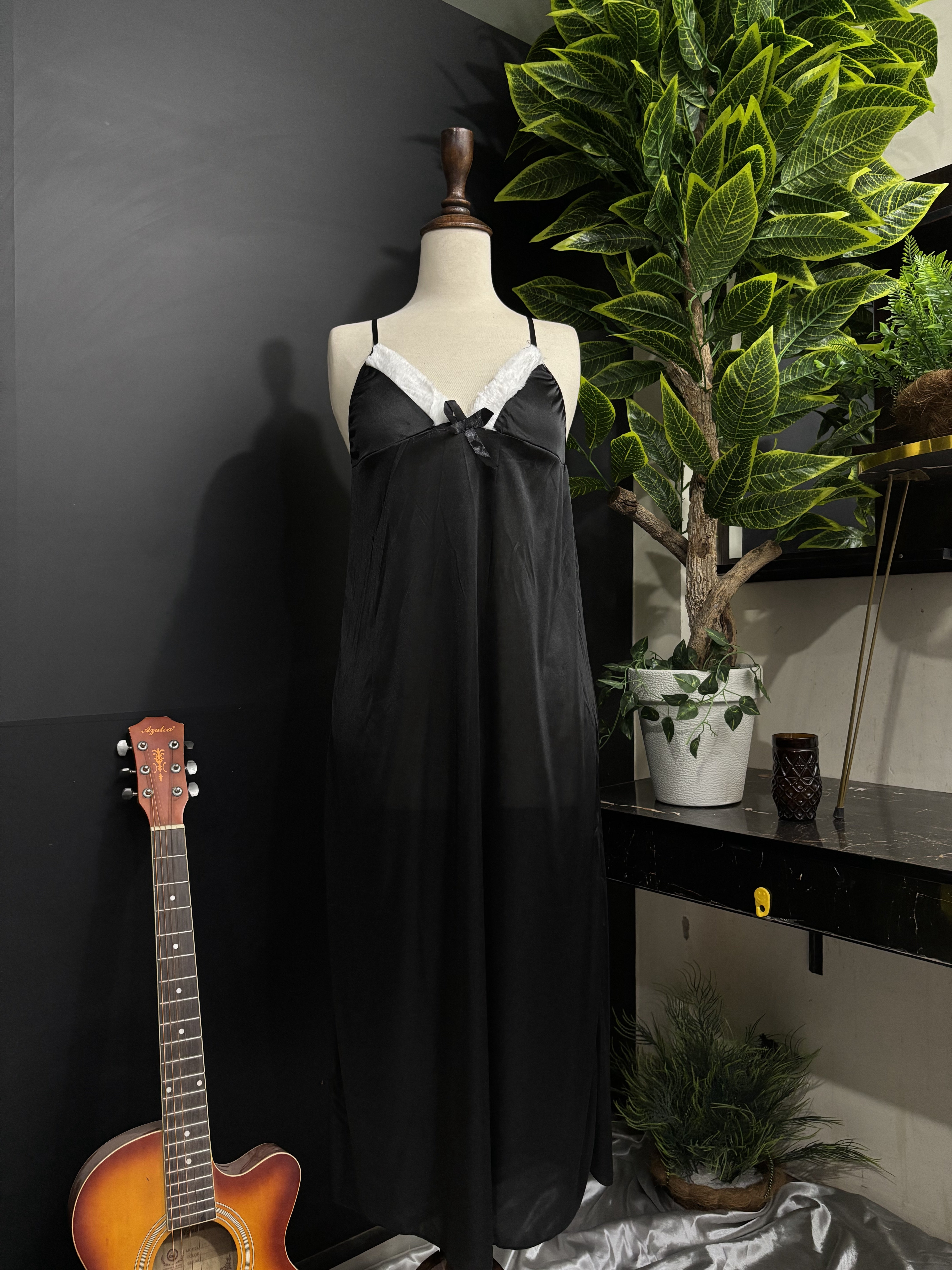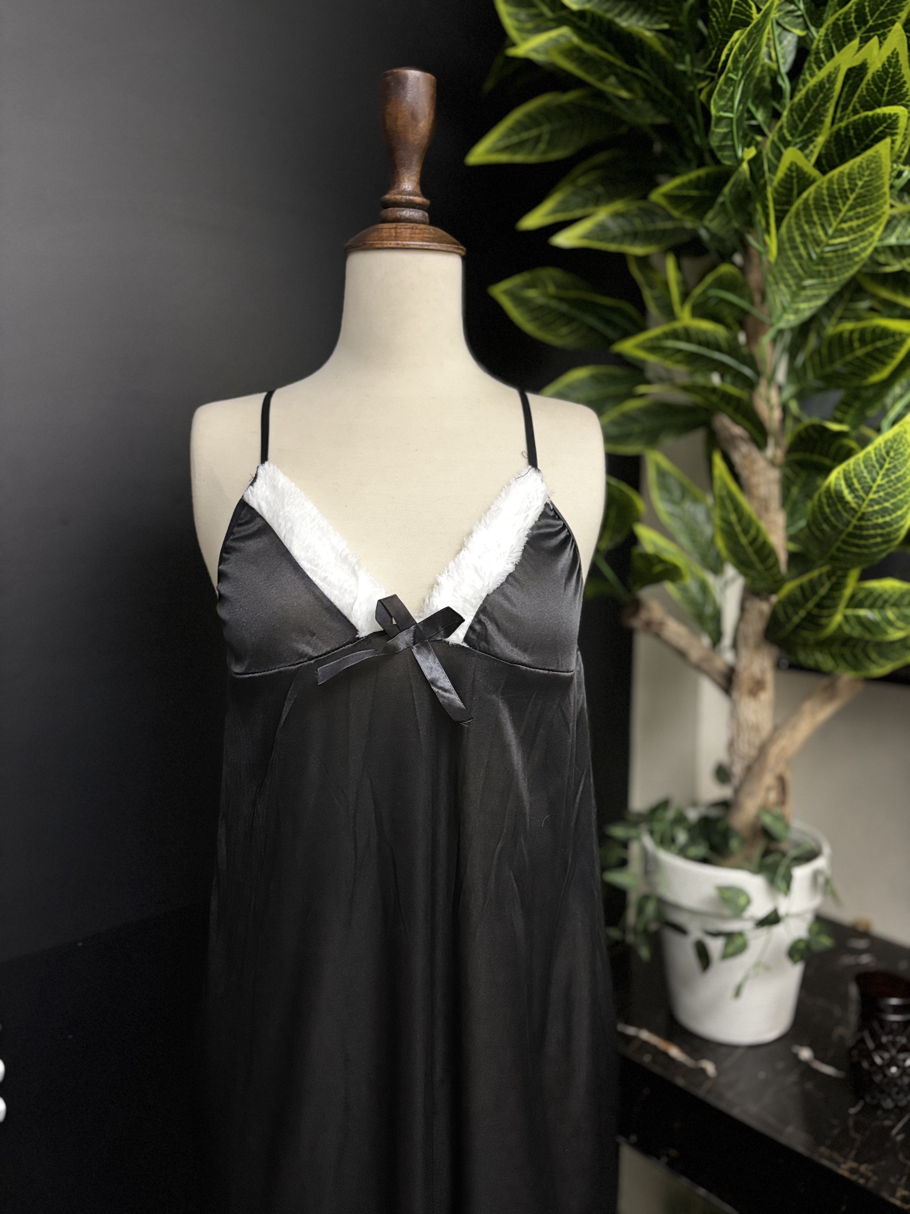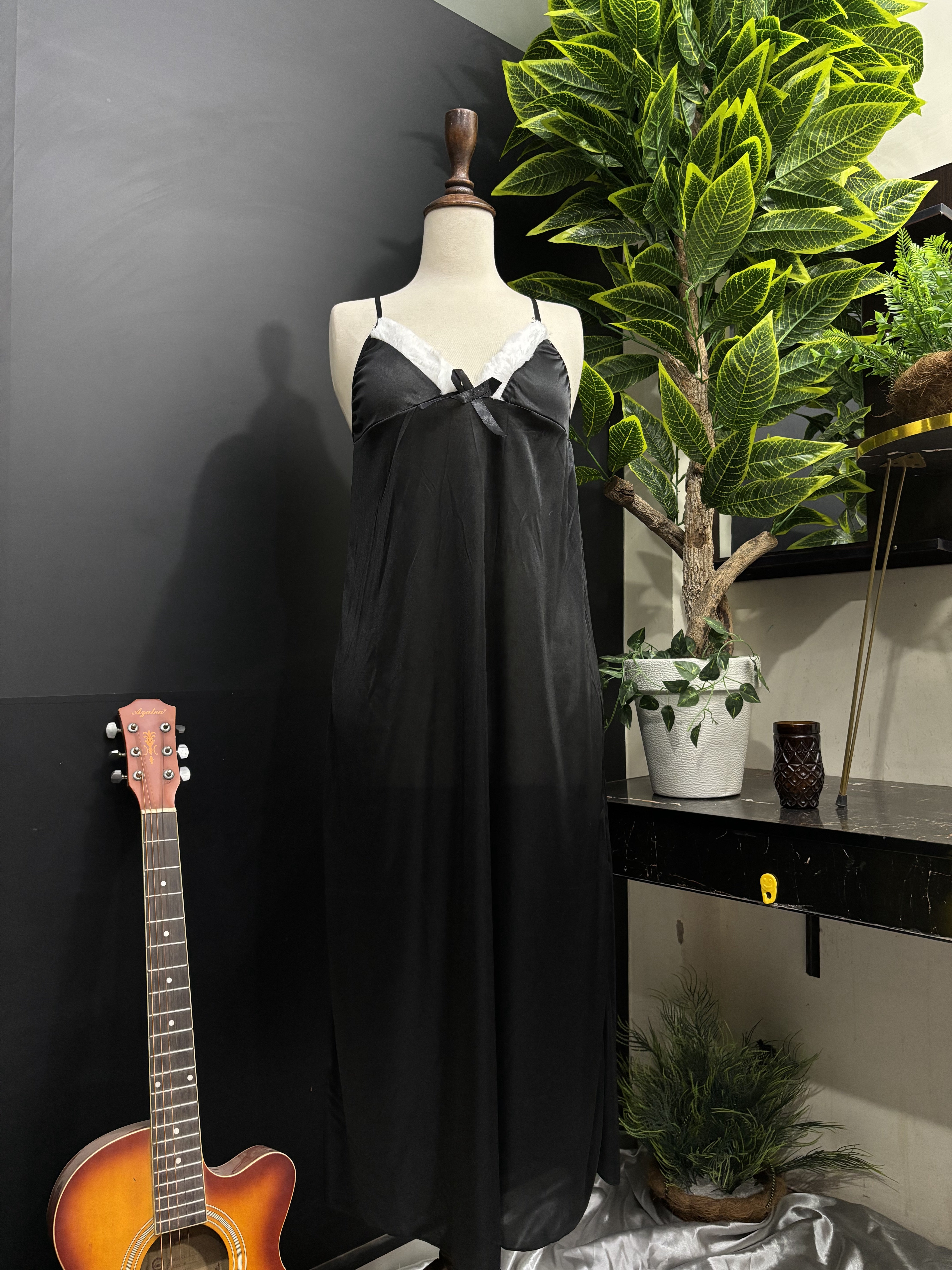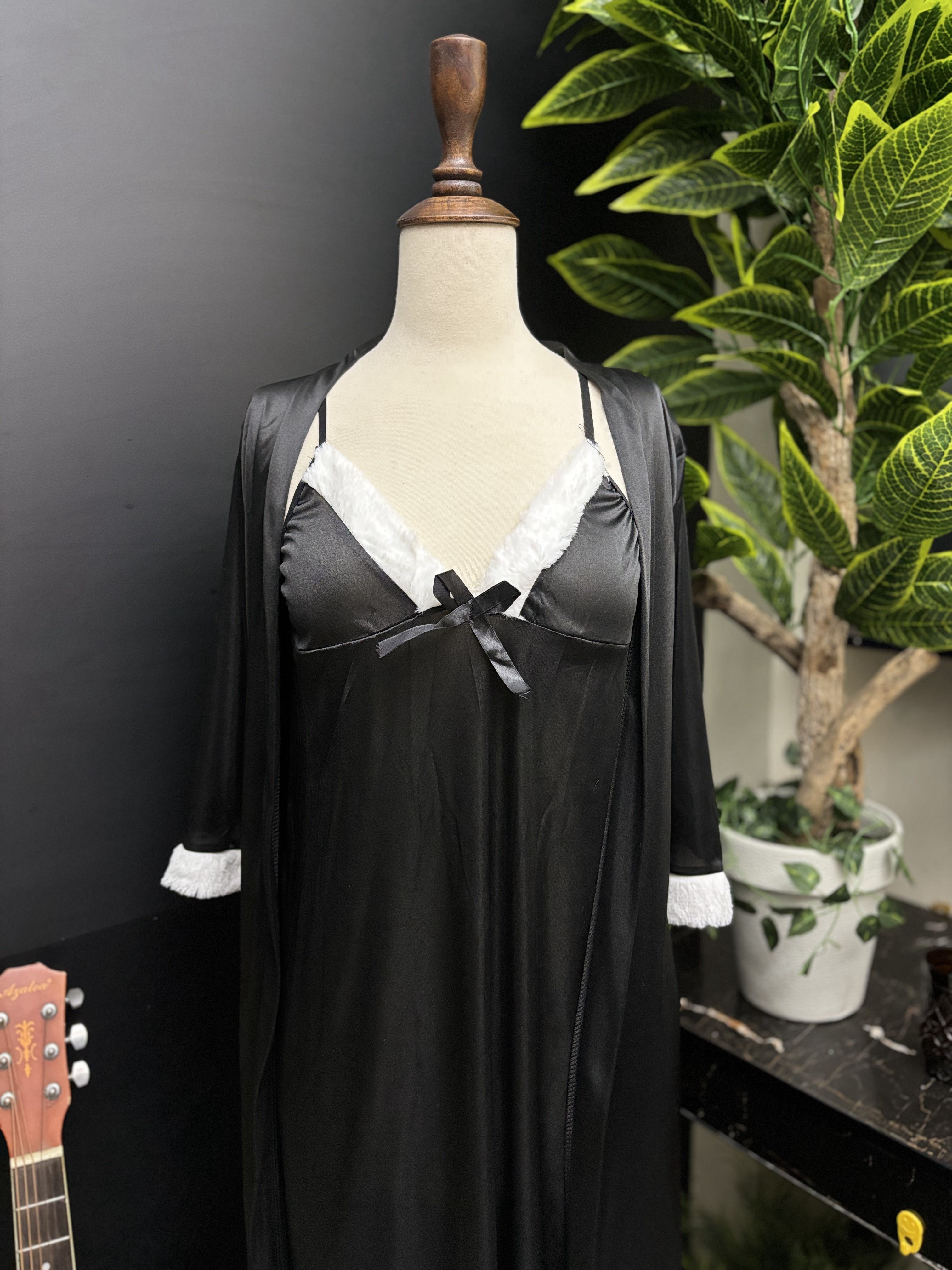 This exquisite set is crafted from a smooth, flowing black satin that drapes beautifully over the body. The long inner slip features delicate spaghetti straps and a V-neckline gracefully trimmed with soft, contrasting white lace and a chic black bow. Its full-length silhouette offers an effortlessly graceful look.
