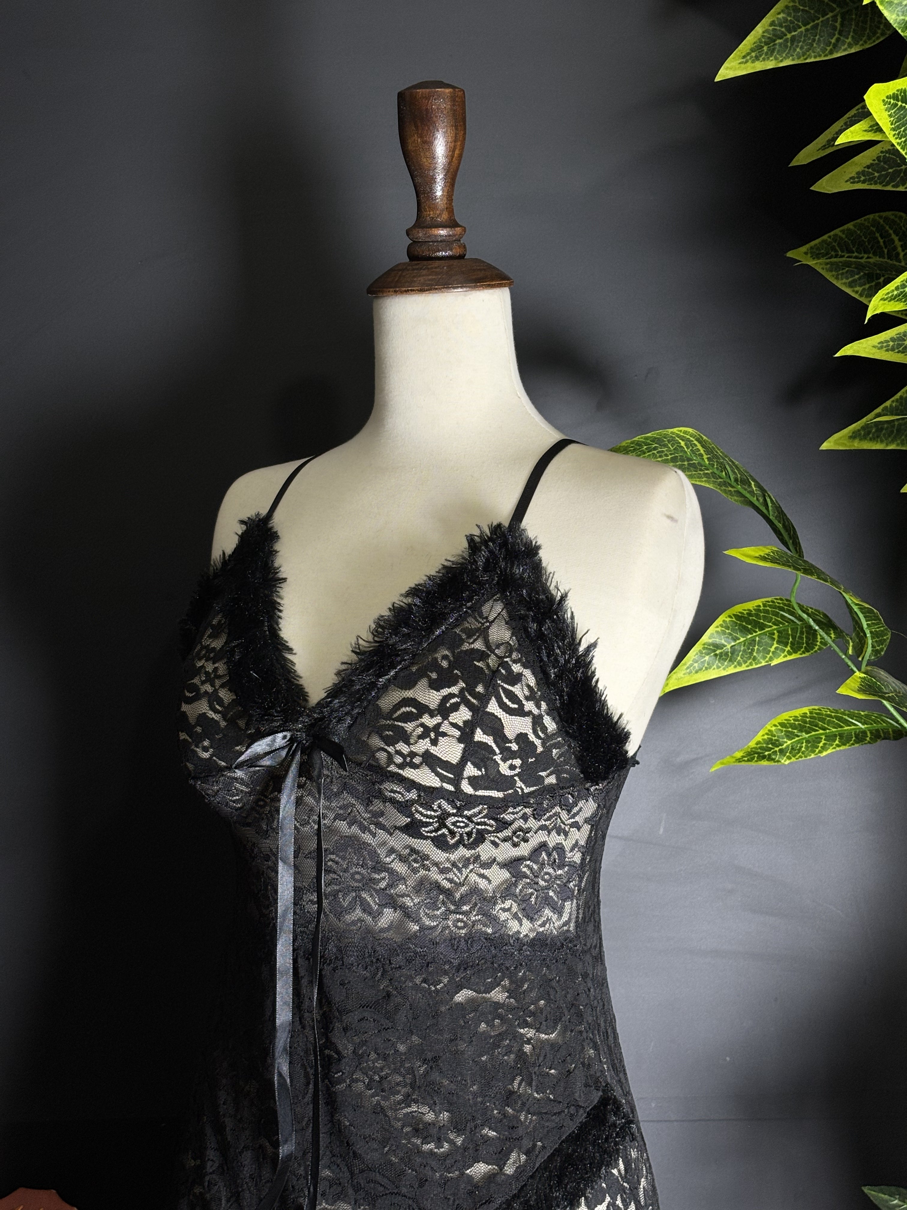 Crafted from stunning, sheer floral lace in a classic black, this babydoll chemise drapes beautifully over your curves. The V-neckline is trimmed with a soft, faux fur that adds a touch of drama and feels exquisite against the skin. A delicate satin ribbon tie at the bust allows for a customizable fit and a sweet, finishing touch.
