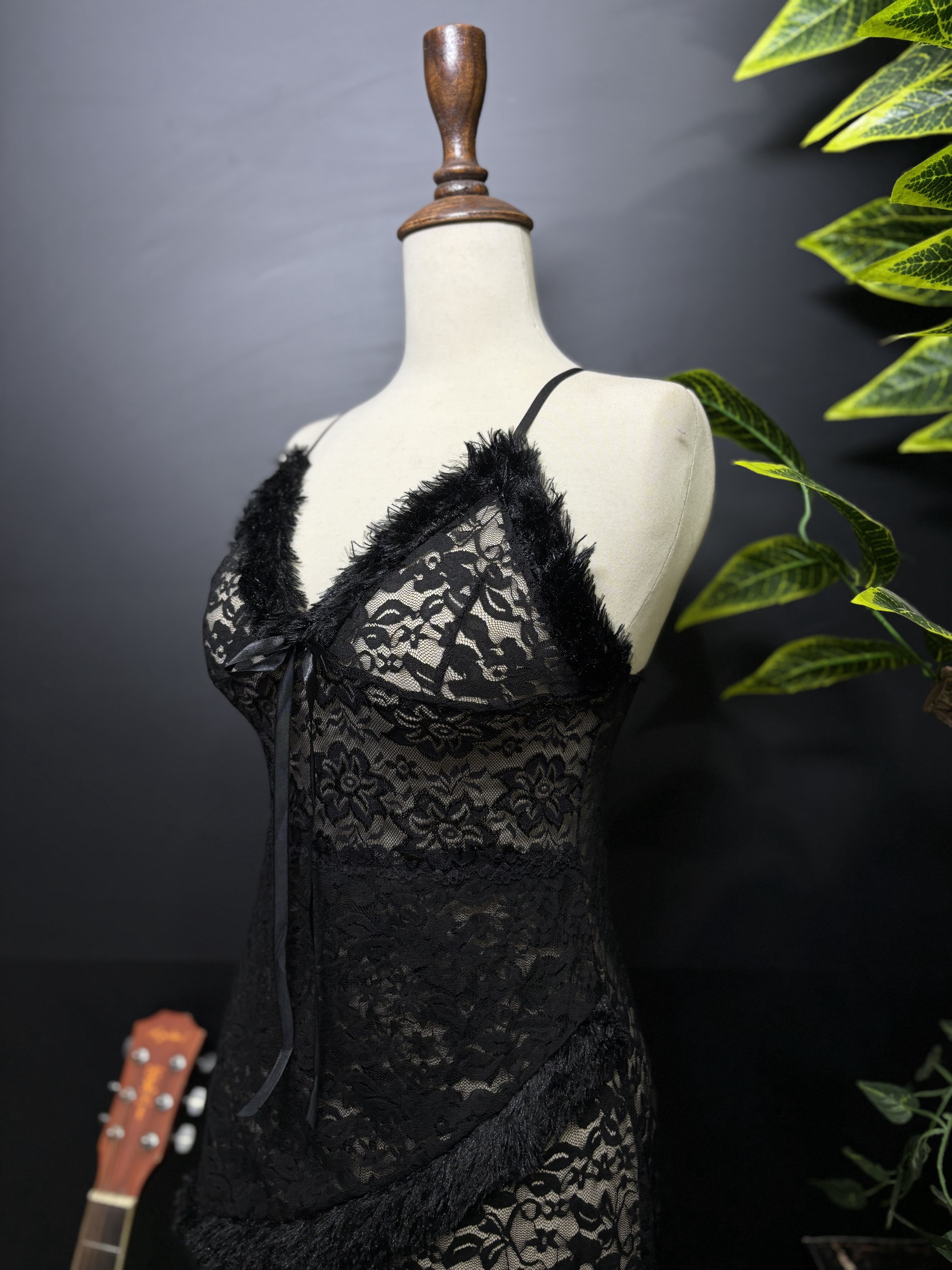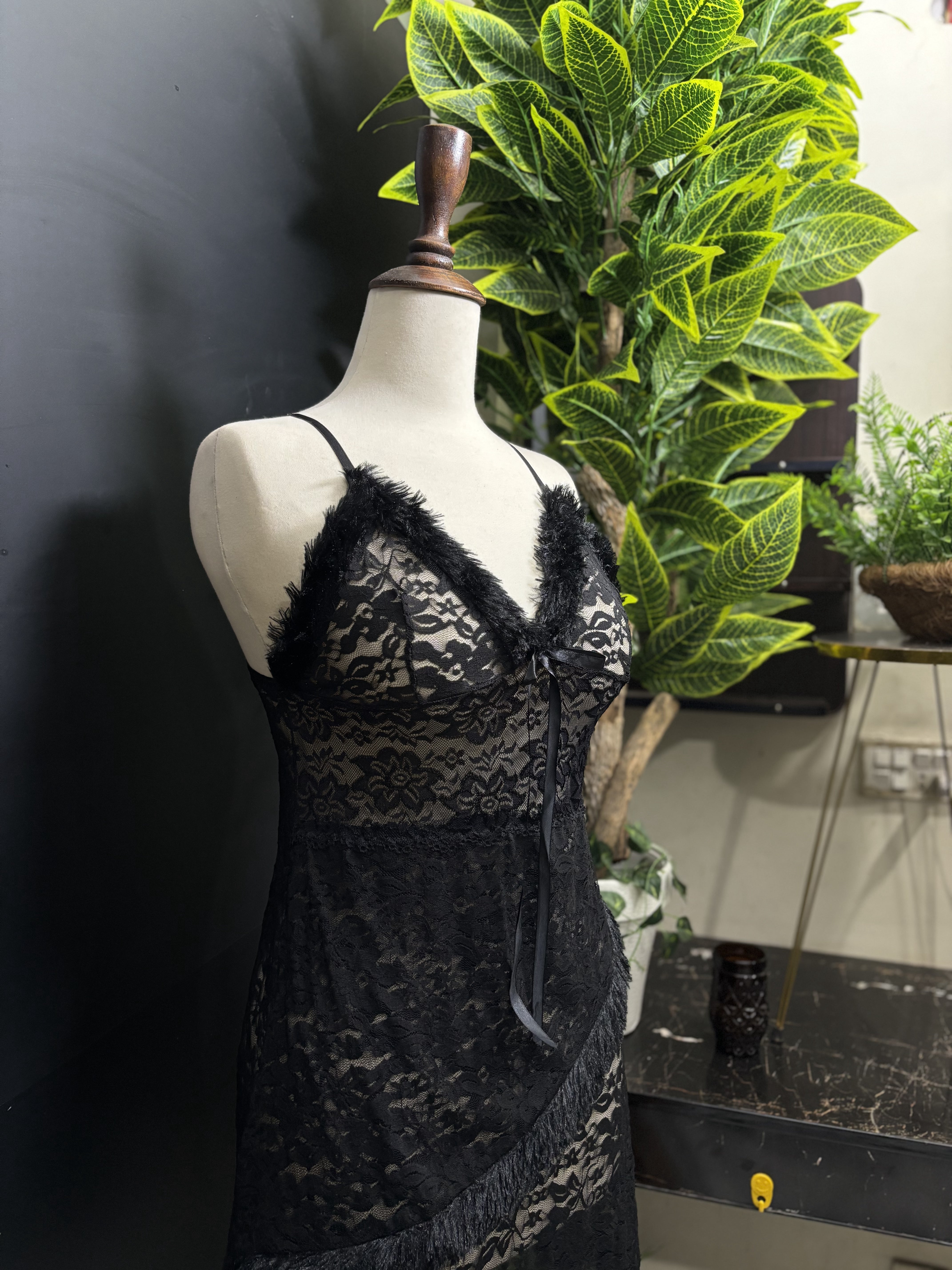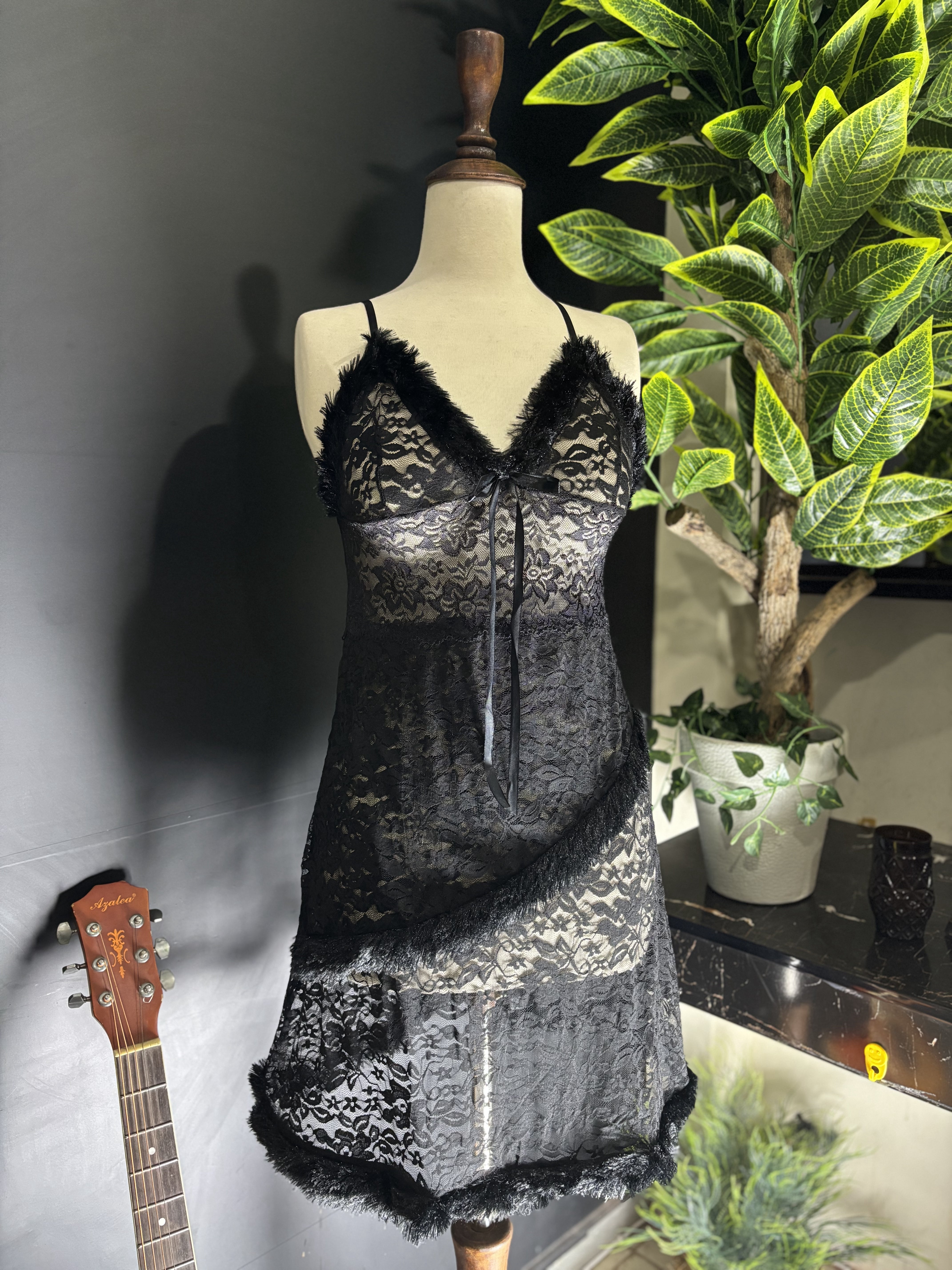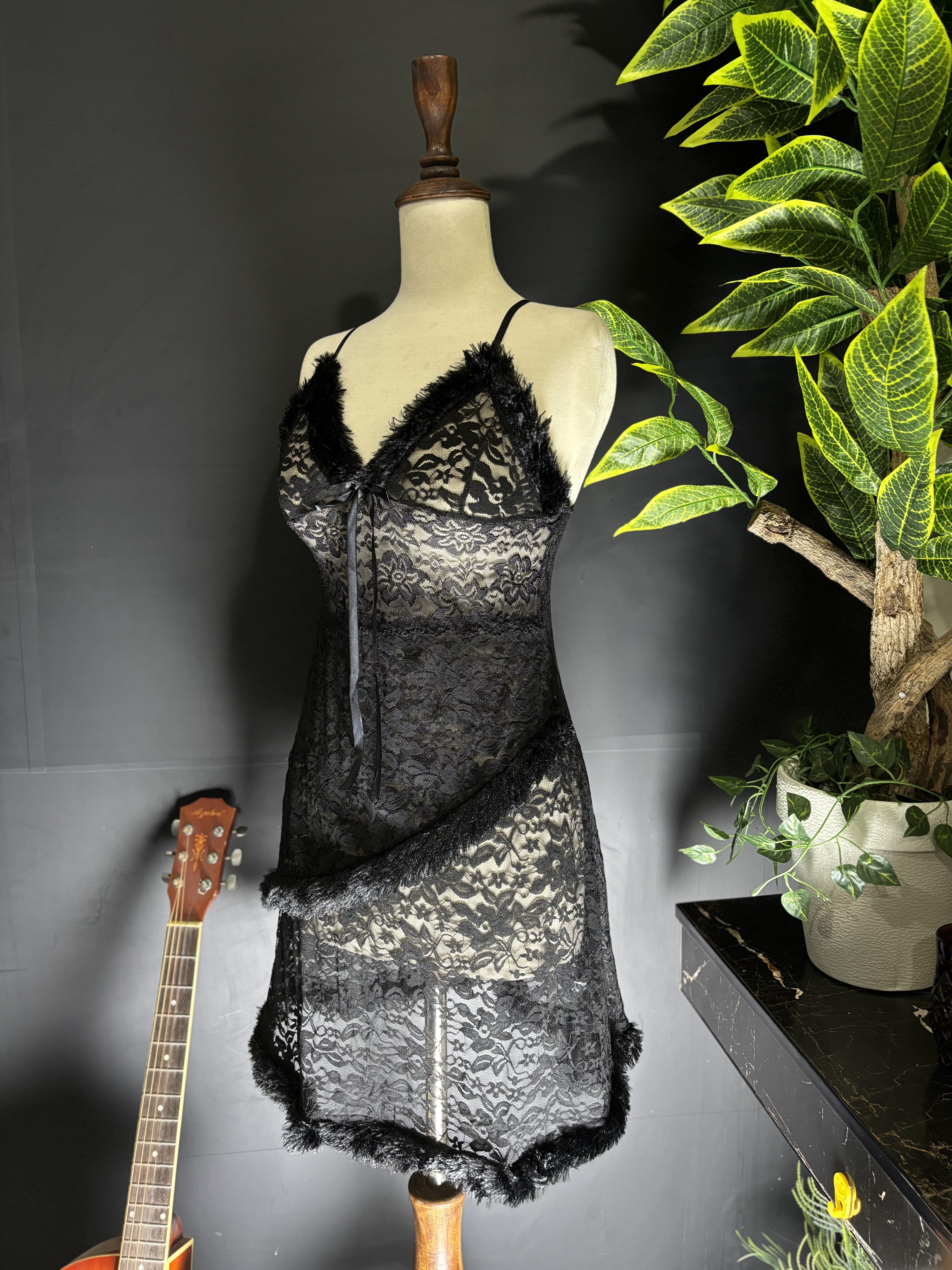 The chemise features an asymmetrical, faux fur-trimmed hem that wraps around the body, creating a unique and flirty silhouette. This set comes complete with a matching lace panty to perfect the look.