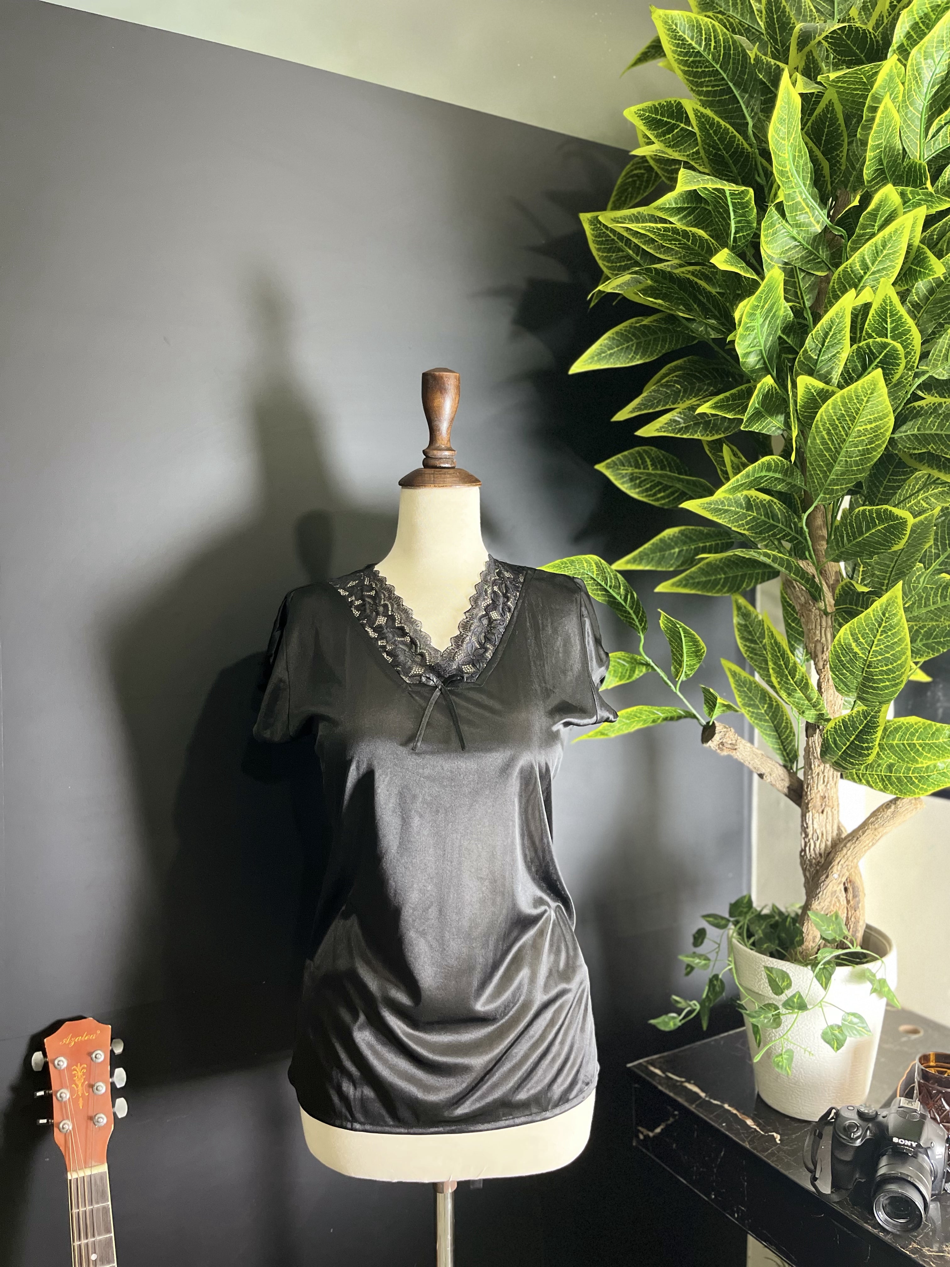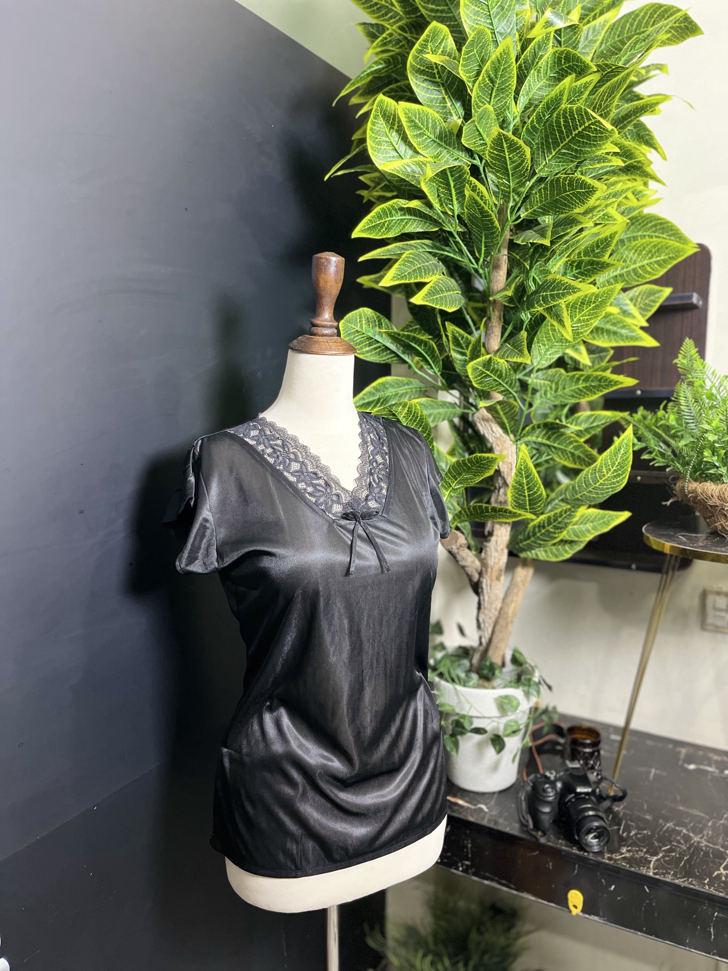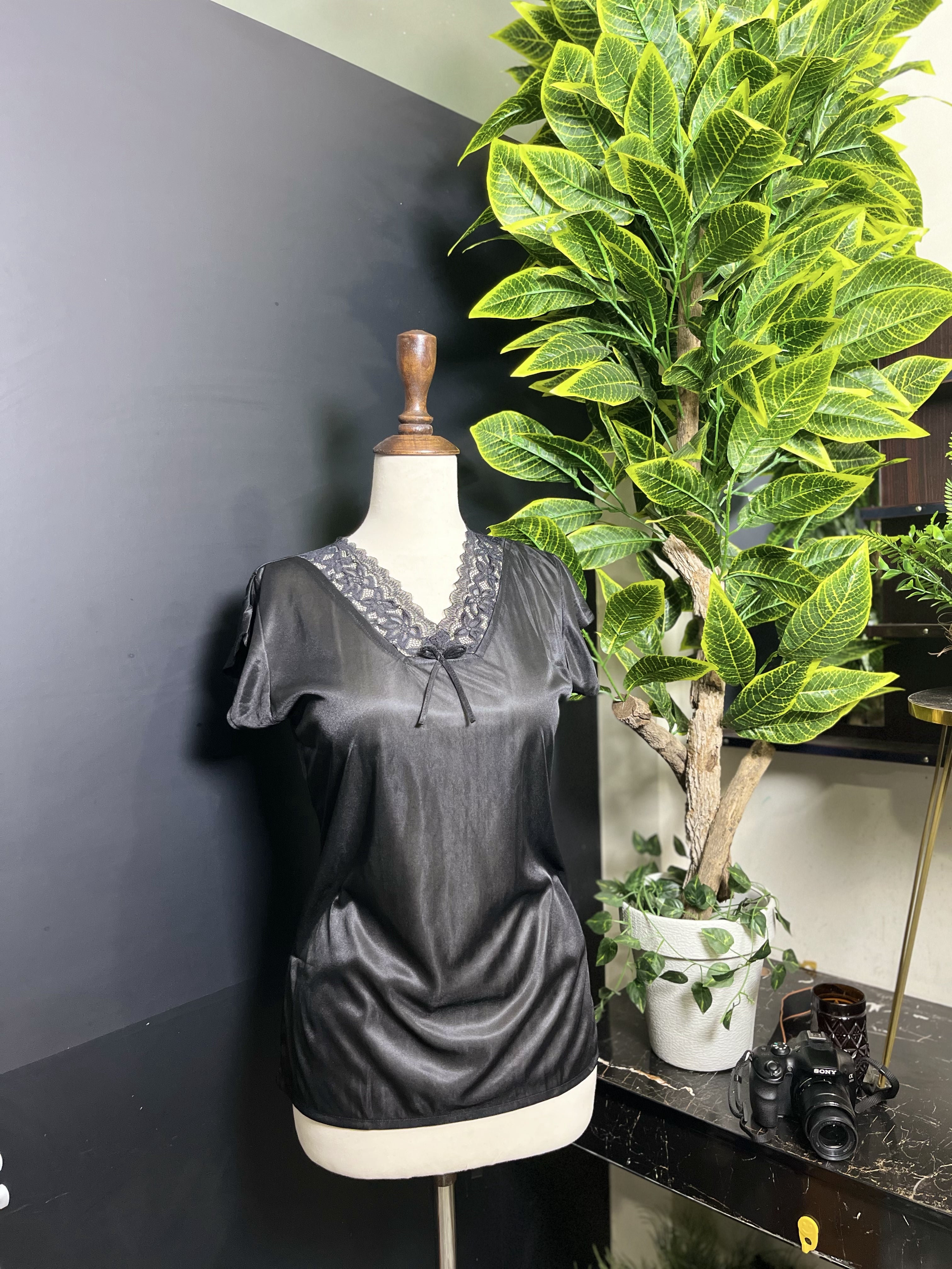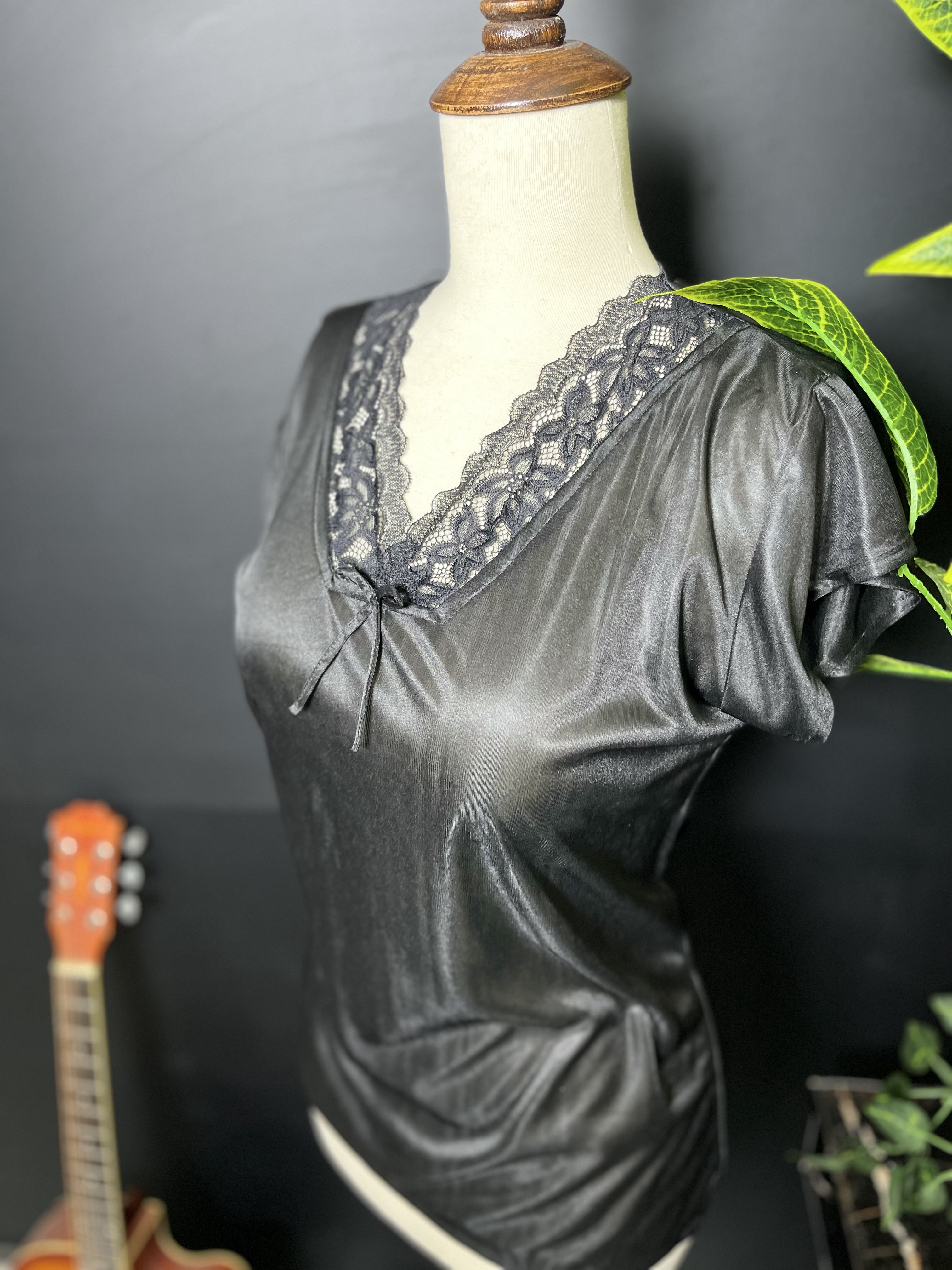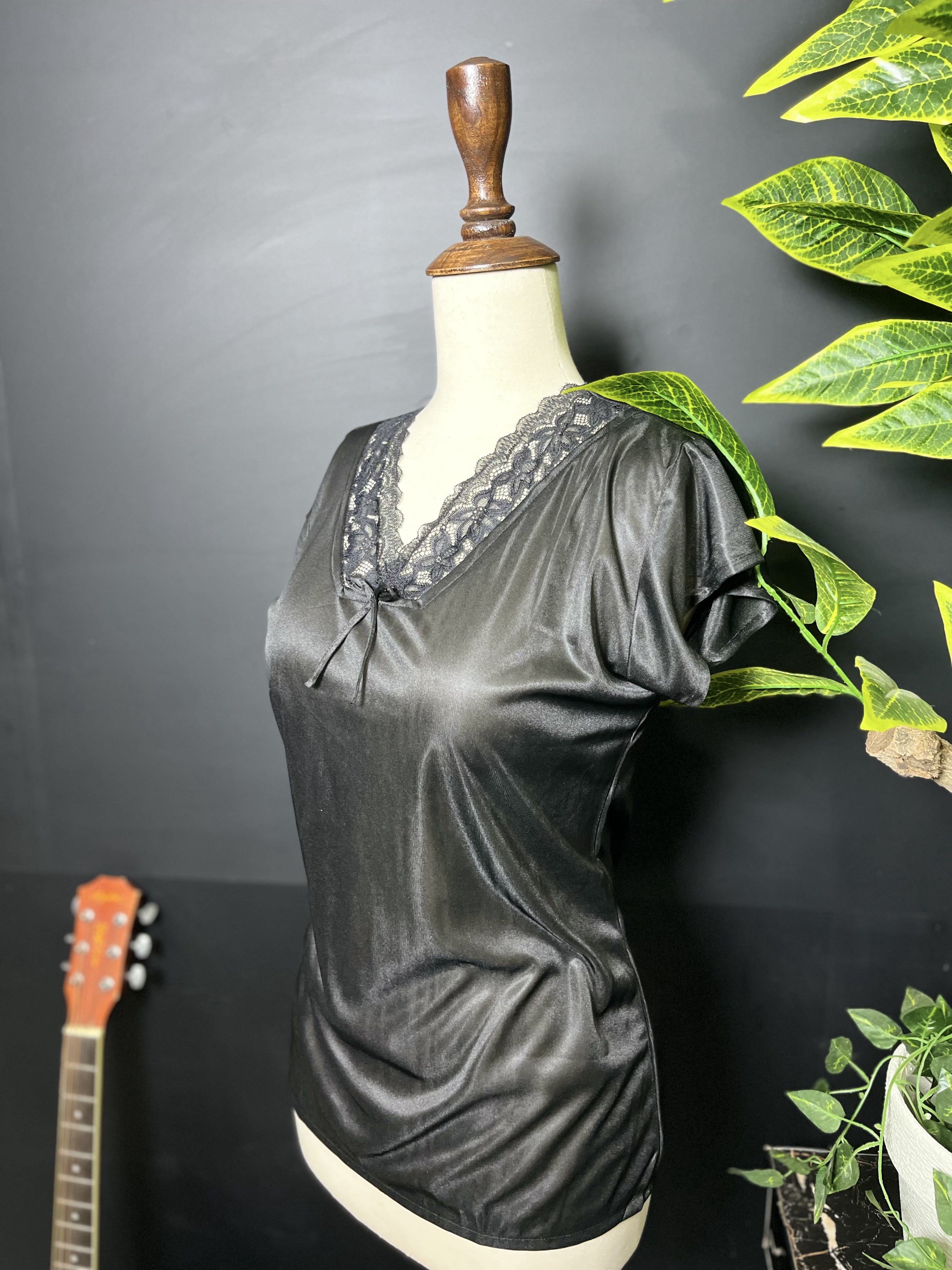 - The Lounge Top: A classic short-sleeve top with a V-neck lace inset for casual lounging.