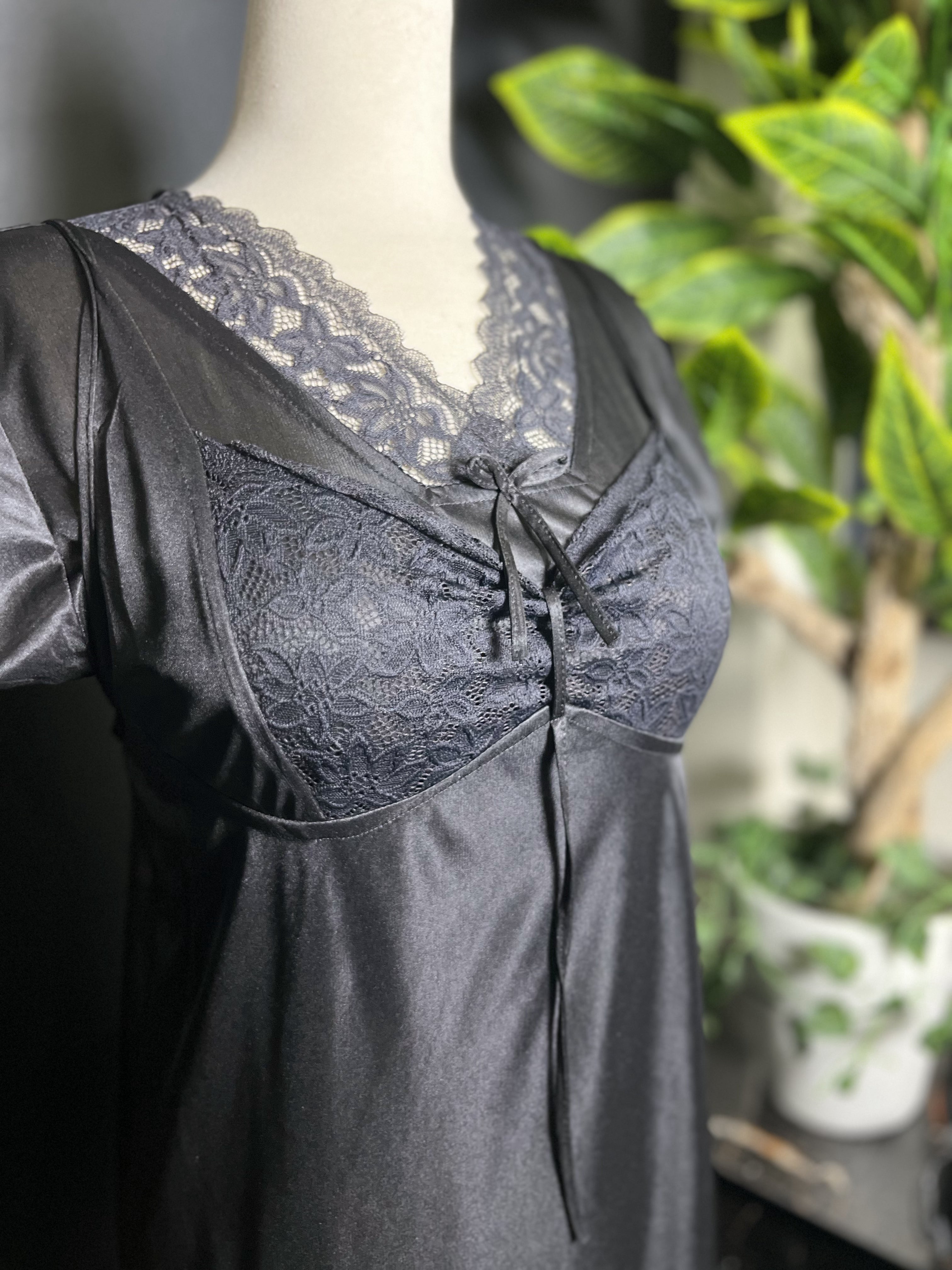 Crafted from premium, high-sheen silk satin, this collection glides against the skin, offering a cooling, lightweight feel perfect for year-round wear. The deep black fabric serves as a dramatic backdrop for the intricate, scalloped floral lace that adorns the necklines and hems.