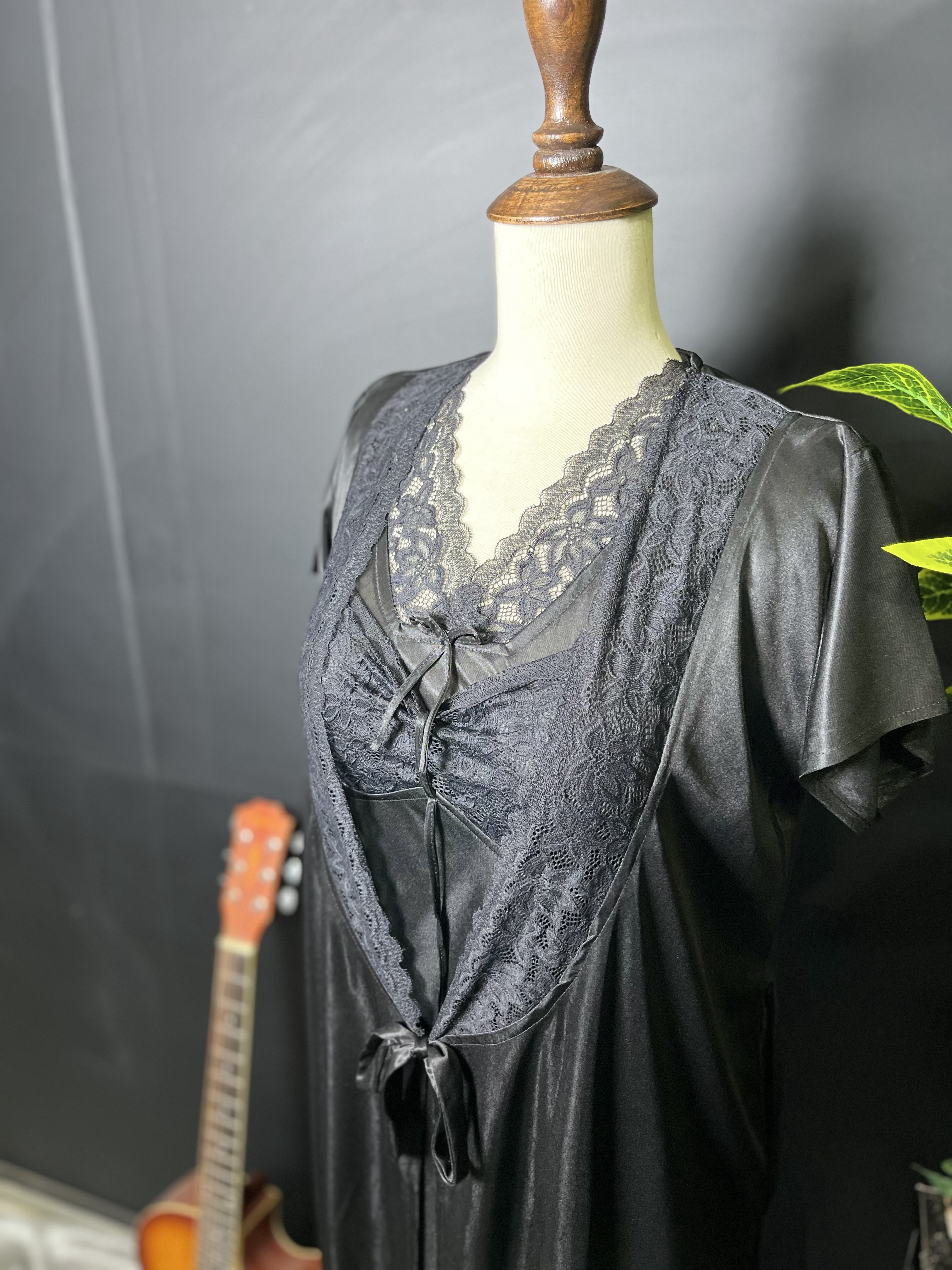 - The Robe: A flowing, open-front kimono-style robe with short sleeves and lace trim—perfect for layering over the other pieces.